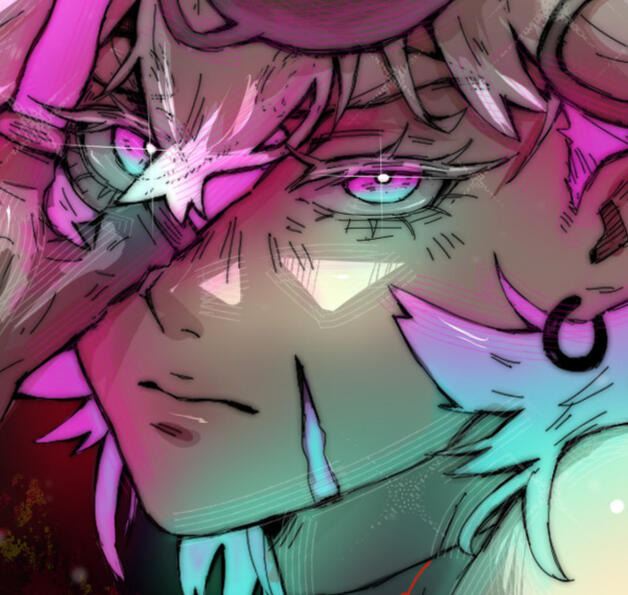 linework of his neighbour and he rubbed his chin in interest, pointy ears twitching to the sound of pen against modern canvas. On the opposite side of said artist was a young man with pink hair slicked back by means of an orange hairband, one hand adjusting his gold-rimmed glasses - his bright amethyst eyes were fixed on the puppet latched to his hairy
